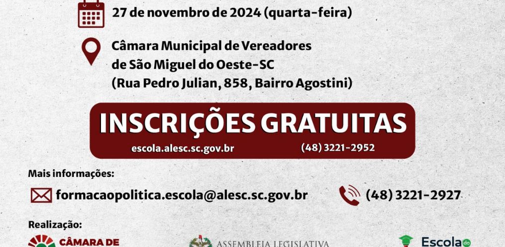 Nesta quarta-feira, 27, São Miguel do Oeste recebe o seminário Legislativo em Ação, “Fui eleito vereador, e agora?”, organizado pela Escola do Legislativo da Alesc. O evento, que ocorre na Câmara de Vereadores, é voltado a vereadores eleitos e futuros assessores dos municípios da Ameosc, com o objetivo de qualificá-los para a atuação parlamentar a partir de 2025.