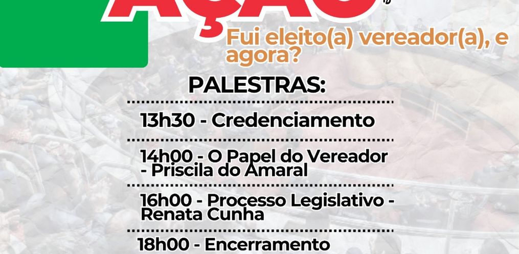 A abertura do seminário será às 13h30, seguida por duas palestras principais. Às 14h, Priscila do Amaral abordará O Papel do Vereador. Já às 16h, Renata Cunha tratará do Processo Legislativo. O encerramento está programado para as 18h.