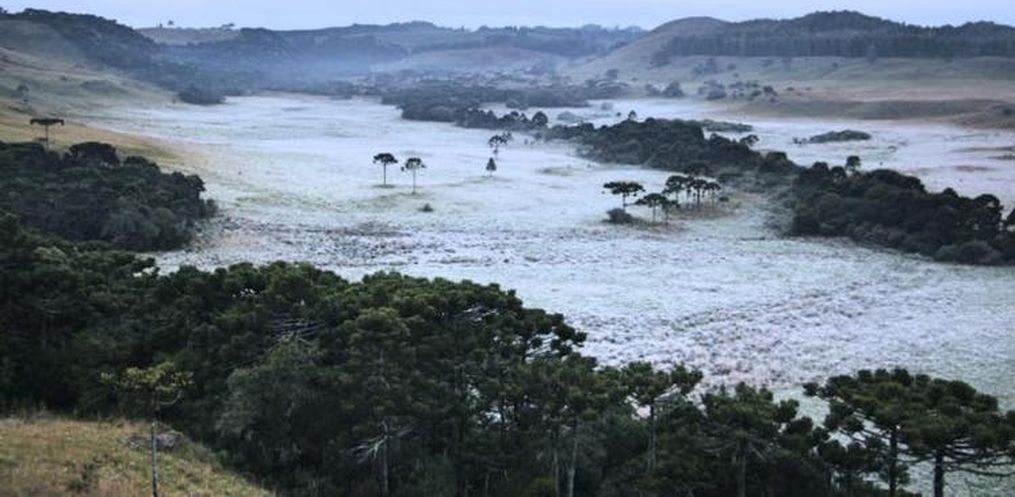 Com a combinação entre frio, baixa umidade, pouco vento e pouca nebulosidade, áreas de baixada ficaram com paisagens cobertas de gelo, como o Vale dos Caminhos da Neve, em São Joaquim.
