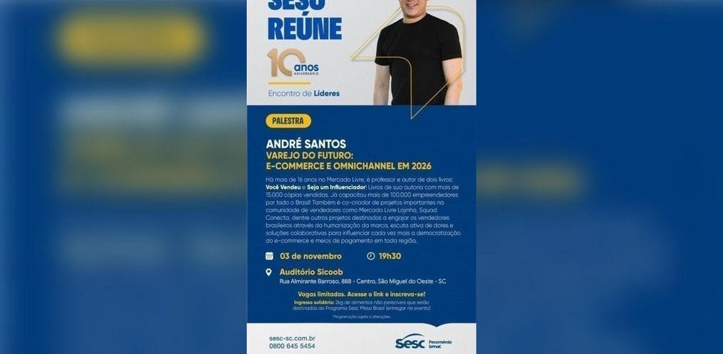 O destaque desta edição é a palestra de André Santos, embaixador do Mercado Livre no Brasil. Ele vai falar sobre e-commerce e comportamento do consumidor, abordando bastidores e estratégias do maior marketplace da América Latina.