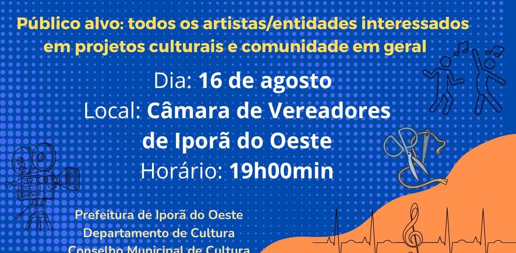 A reunião vai acontecer no dia 16 de agosto, quarta-feira, às 19h, na Câmara de Vereadores. Todos os artistas e entidades que possuem ligação com a cultura estão convidados a participar, pois na oportunidade também serão repassadas maiores informações sobre a operacionalização da Lei Paulo Gustavo em Iporã do Oeste.