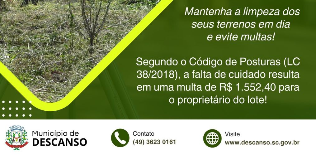 A falta de manutenção adequada dos terrenos urbanos tem levado os ficais do Setor de Engenharia da Prefeitura de Descanso a vistoriar, notificar e, em casos necessários, multar os proprietários dos imóveis que não estão de acordo com a Lei Complementar nº 38/2018 que integra o Código de Posturas municipal.