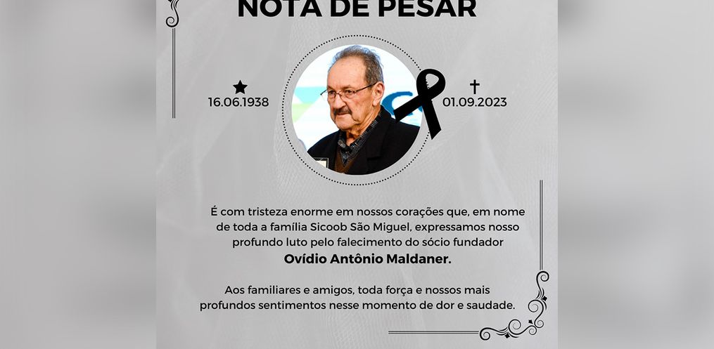 É com tristeza enorme em nossos corações que, em nome de toda a família Sicoob São Miguel, expressamos nosso profundo luto pelo falecimento do senhor Ovídio Antônio Maldaner, aos 85 anos de idade.