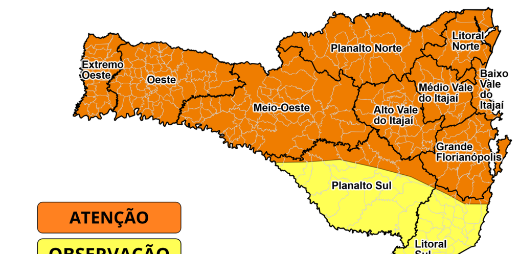 A Defesa Civil alerta para chuva intensa acompanhada de raios, rajadas de vento e eventual queda de granizo. As regiões mais afetadas devem ser o Grande Oeste, Planalto Norte, Vale do Itajaí, Litoral Norte e Grande Florianópolis.