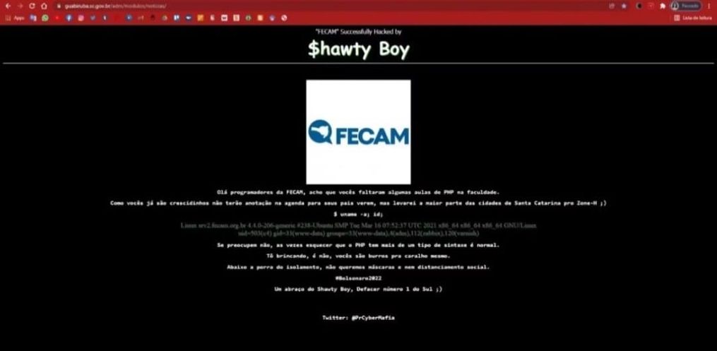 O hacker, que se apresentou com o nome de Shawty Boy, deixou mensagens contra o isolamento social e de apoio ao presidente Jair Bolsonaro - conforme imagem. Além disso, ainda ameaçou invadir outras prefeituras e chamou os programadores do sistema de burros.