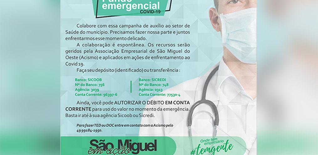 O Projeto São Miguel em Ação, criado e coordenado pela Associação Empresarial de São Miguel do Oeste (Acismo) e com apoio de entidades, Clubes de Serviço, empresas e empresários, lança, nesta quarta-feira, 31, um fundo emergencial para arrecadação de recursos para aplicação em ações de enfrentamento a pandemia do Covid-19. As ações de aplicação serão definidas por uma comissão formada pelas instituições integrantes do projeto.