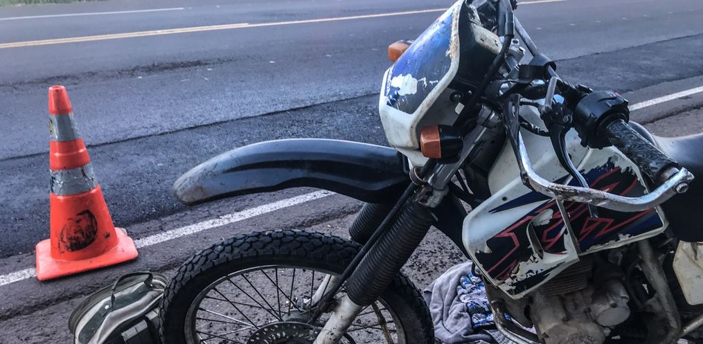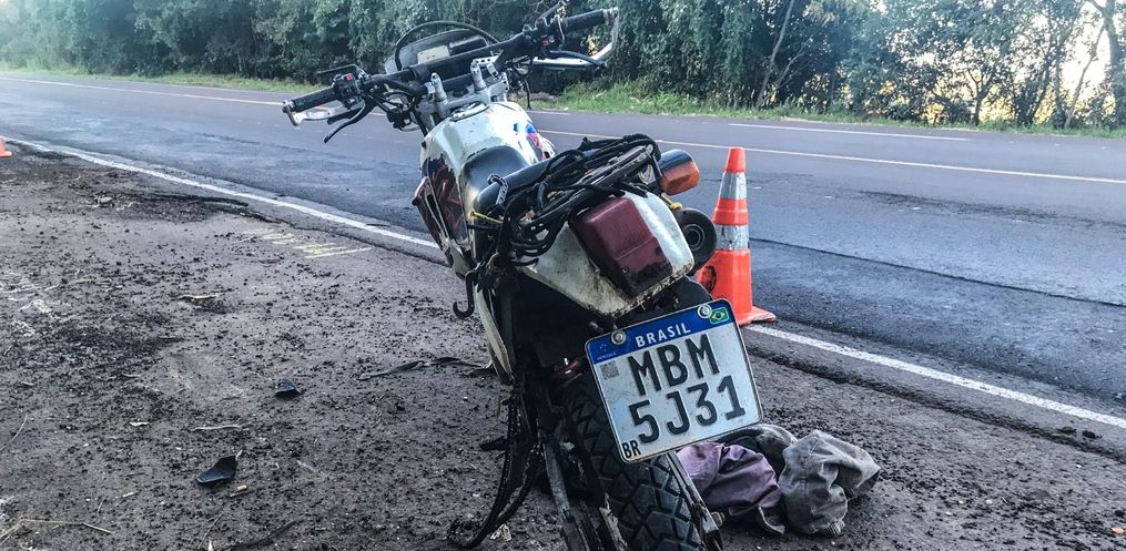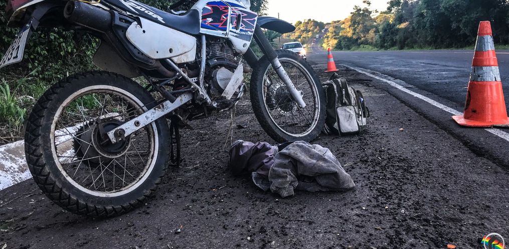 A queda de moto, uma Honda/XR 200 com placas de Guaraciaba, aconteceu entre o Posto Bela Vista e a Cooperoeste Terra Viva.