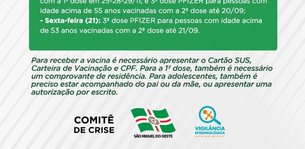 - Sexta-feira (21): 3ª dose PFIZER para pessoas com idade acima de 53 anos vacinadas com a 2ª dose até 21/09.