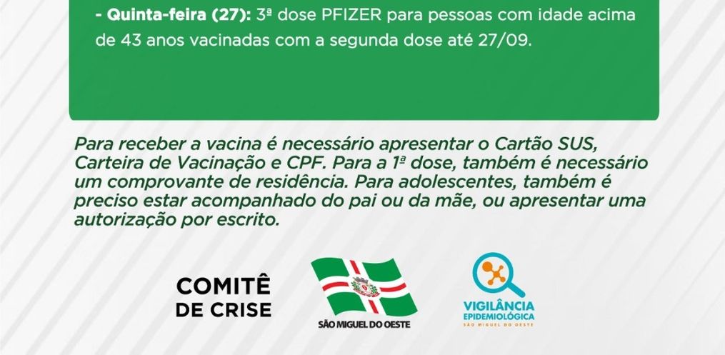 - Quinta-feira (27): 3ª dose PFIZER para pessoas com idade acima de 43 anos vacinadas com a segunda dose até 27/09.