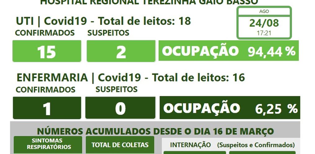 A ocupação desta segunda-feira, 24, é de 15 pacientes confirmados e 2 suspeitos na UTI. Na enfermaria, com a alta da UTI, a ocupação é de 1 paciente positivo.