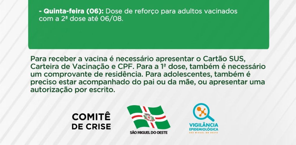 - Terça-feira (04): Dose de reforço para adultos vacinados com a 2ª dose até 04/08;