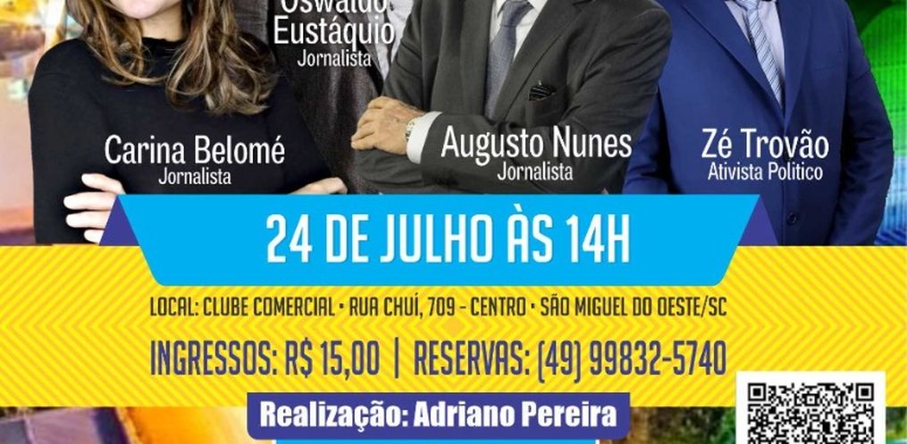 Segundo Itamar, o evento começará às 14horas, e terá seis palestrantes confirmados: Augusto Nunes – jornalista Pingo nos ‘Is’, Oswaldo Eustáquio – jornalista da Gazeta, Carina Belomé – jornalista e Zé trovão – Ativista político.