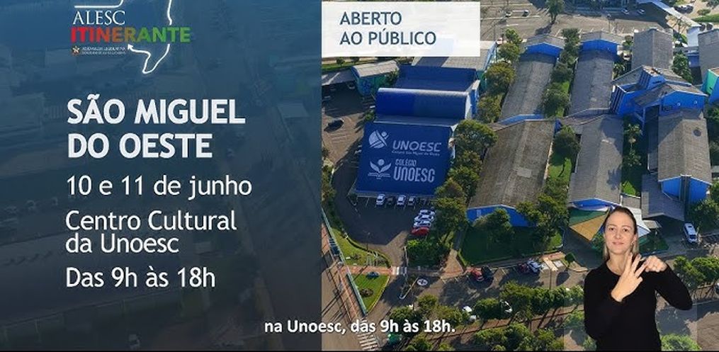O município de São Miguel do Oeste vai receber na próxima semana a primeira edição do “Alesc Itinerante” de 2025. A ação vai ocorrer nos dias 10 e 11 de junho e nesses dias, todas as sessões plenárias e reuniões de comissões da Assembleia Legislativa de Santa Catarina vão acontecer no Centro Cultural da Unoesc, em São Miguel do Oeste, entre 8h e 18h.