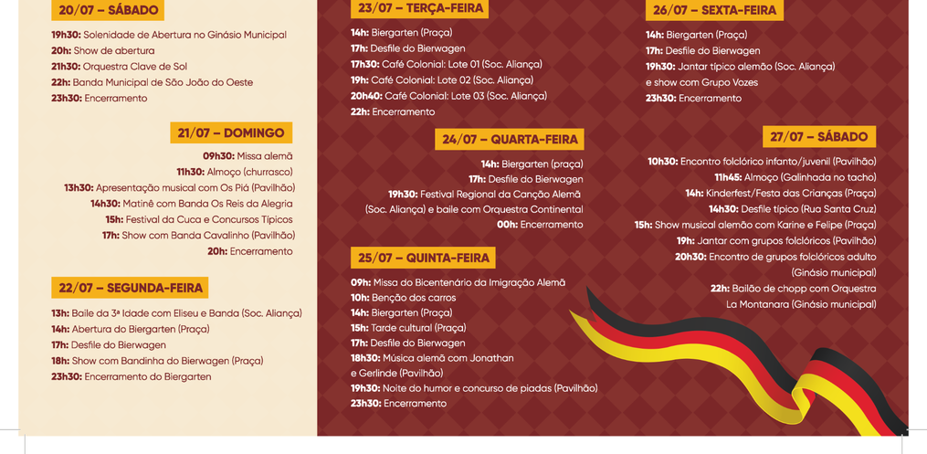 A 14ª Semana Alemã vai iniciar neste sábado, 20 e prossegue até o dia 27 de julho em São João do Oeste. Serão oito dias com apresentações culturais, concursos, jantar típico, distribuição de chope, encontro de grupos folclóricos e desfile.