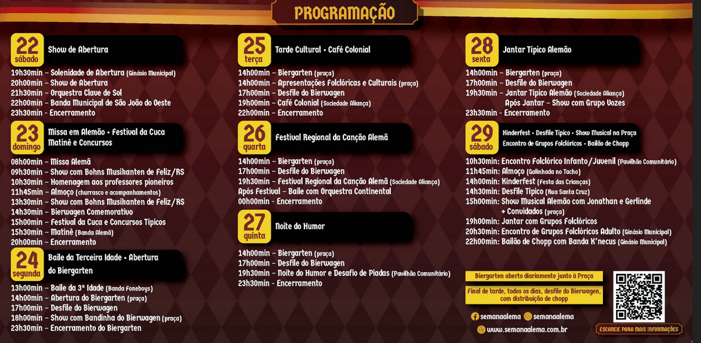 A 13ª Semana Alemã vai iniciar neste sábado, 22, e prossegue até o dia 29 de julho em São João do Oeste. Serão oito dias com apresentações culturais, concursos, jantar típico, distribuição de chope, encontro de grupos folclóricos e desfile.