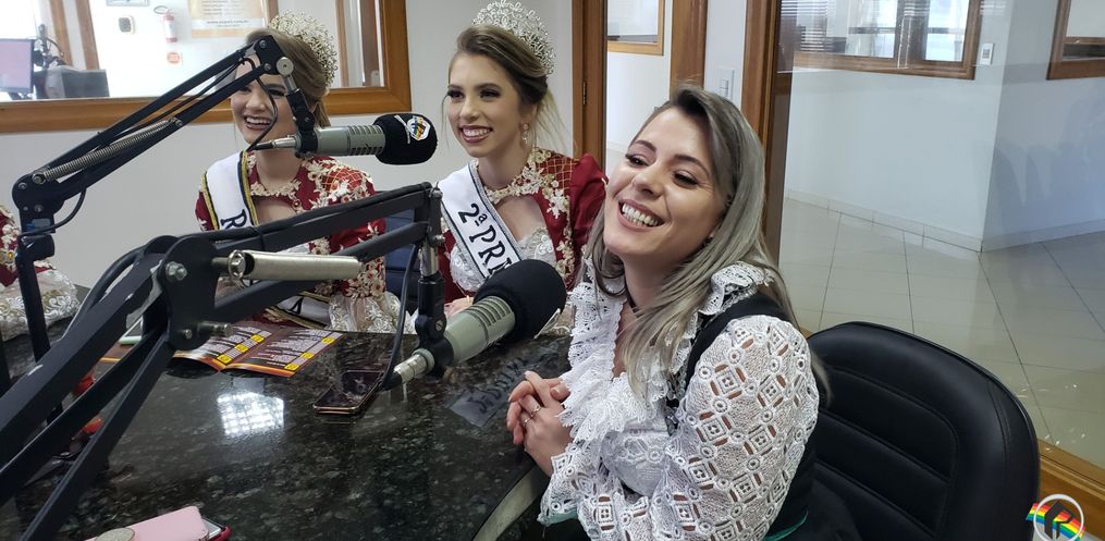 Na manhã desta terça-feira, 18, a Rainha Laura Specht de Oliveira, a 1ª Princesa Cristine Immig e a 2ª Princesa Pâmela Schneider Martins, estiveram nos estúdios da Rádio Itapiranga, juntamente com o Secretário de Administração, André Klunk e a Assessora de Imprensa, Simone Braun, divulgando a 13ª Deutsche Woche.