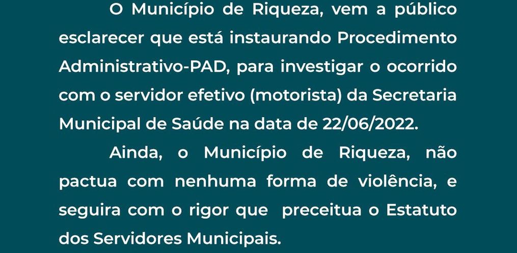 A Peperi entrou em contato com o prefeito de Riqueza, Renaldo Mueller, que confirmou que o suspeito é motorista do setor da saúde do município. Na manhã desta quinta-feira, o Município de Riqueza emitiu uma nota oficial, através da Assessoria de Imprensa, onde afirma que está instaurando um Procedimento Administrativo para investigar o ocorrido com o servidor efetivo da Secretaria Municipal de Saúde, que não pactua com nenhuma forma de violência e seguirá com o rigor que preceitua o Estatuto dos Servidores Municipais.