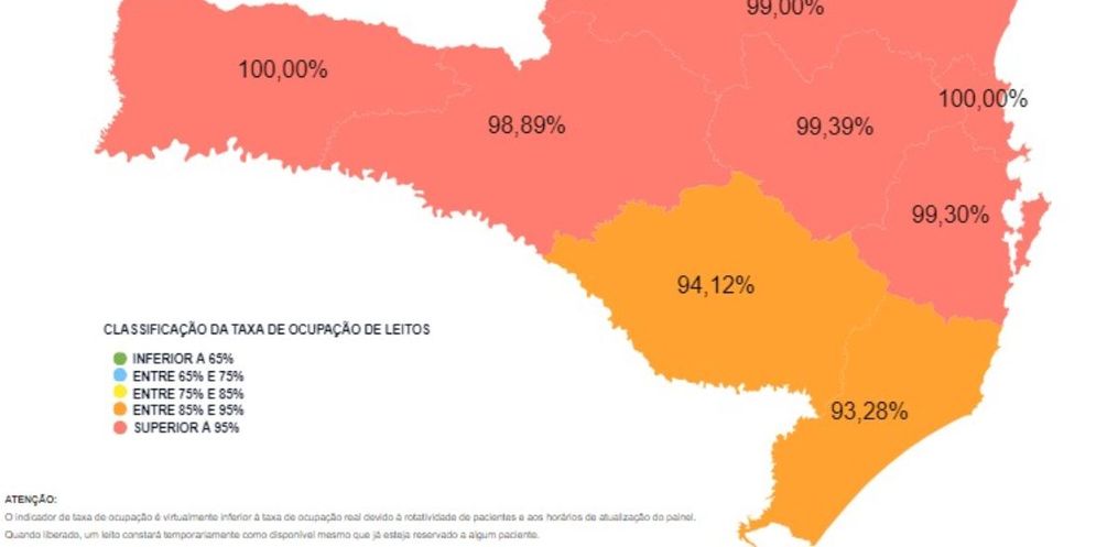 A situação das Unidades de Terapia Intensiva (UTIs) adulto na rede estadual de Santa Catarina atingiu um nível "gravíssimo", com apenas 17 dos 898 leitos ativos disponíveis, resultando em uma taxa de ocupação de 98,19%. As regiões do Grande Oeste e da Foz do Rio Itajaí enfrentam uma escassez total de leitos para pacientes, enquanto outras regiões, como Grande Florianópolis, Vale do Itajaí, Norte e Nordeste, e Meio-Oeste, registram mais de 99% de ocupação.