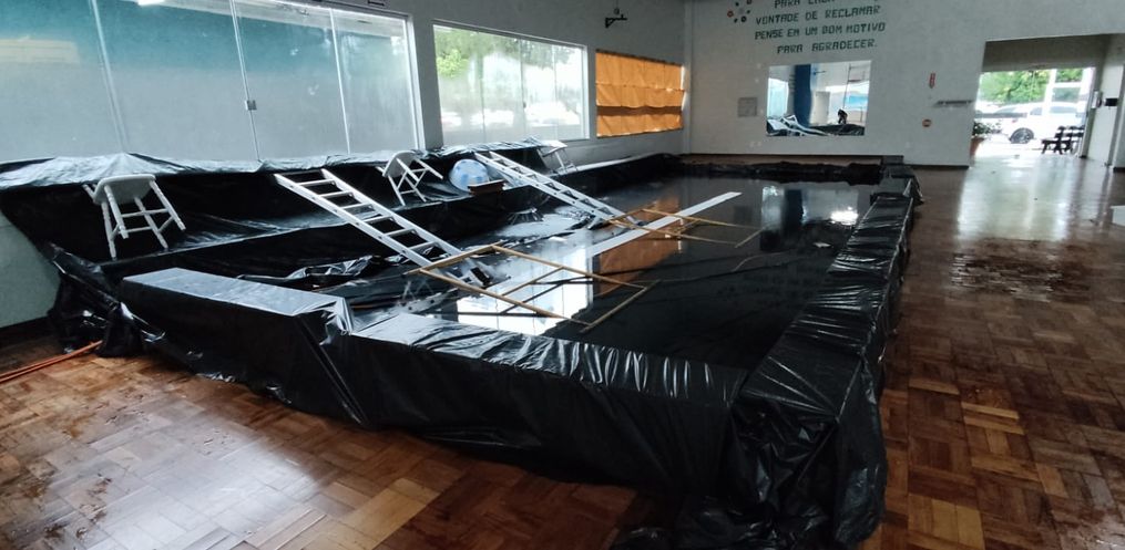 Malvessi menciona que três tesouras de ferro entortaram e acabaram entortando, fazendo com que o telhado baixasse e a agua não fosse para as calhas. Ressalta ainda, que a água está molhando todo o salão, sendo necessário realizar uma piscina de contenção e drenagem para não danificar o piso de madeira.
