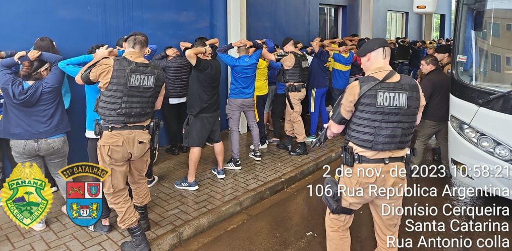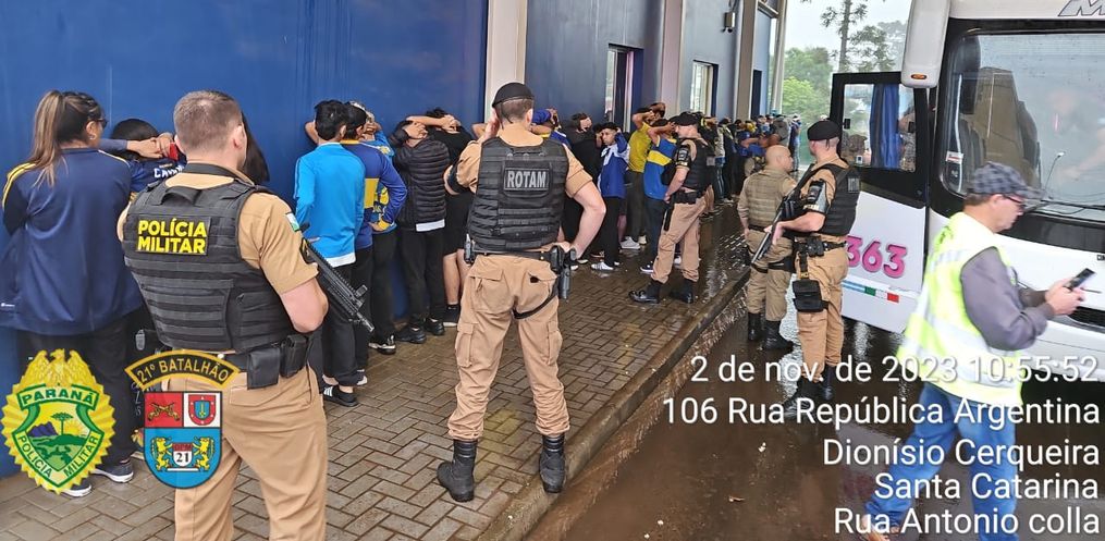 Folhas de “COCA” são encontradas em um ônibus vindo da Argentina, com torcedores do Boca Junior. A fiscalização foi registrada na manhã desta quinta-feira, por volta das 08h35, na Aduana de Turismo de Dionísio Cerqueira, quando a equipe da Rotam prestou apoio a Polícia Federal e Polícia Militar cerqueirense durante uma abordagem a um ônibus de torcedores do Boca Juniors.