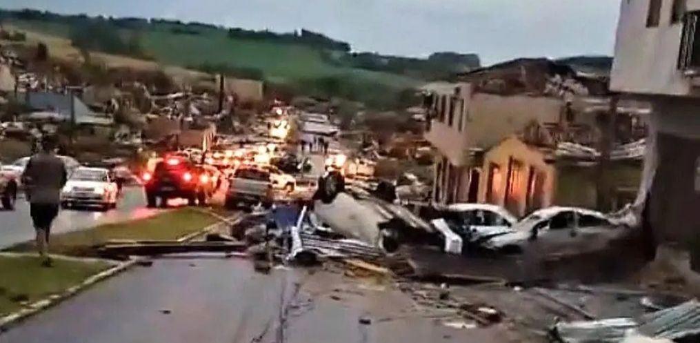 Cinco pessoas morreram e mais de 400 ficaram feridas após a passagem de um tornado em Rio Bonito do Iguaçu, no interior do Paraná, nesta sexta-feira, 7. De acordo com a Defesa Civil, o fenômeno deixou ao menos 80% da cidade destruída, com casas destelhadas, imóveis danificados e postes de energia no chão. Com informações do g1.