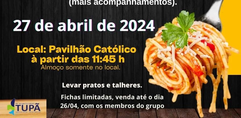 O grupo Escoteiro Tupã de Iporã do Oeste vai promover neste sábado,27, a tradicional macarronada, evento que acontece anualmente no município. Conforme o presidente do grupo Jeferson Blatt, a programação será realizada no pavilhão católico, com início às 11h45. O almoço será à base de diversos tipos de massas, molhos, e demais acompanhamentos.