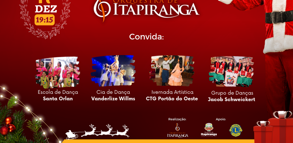 O tradicional show de fim de ano da Orquestra de Itapiranga, acontece no dia 17 de dezembro, domingo, na Praça das Bandeiras De acordo com o maestro da Orquestra, Henrique Drebel, neste ano, o show terá novidades, com o tema: Música e Movimento.