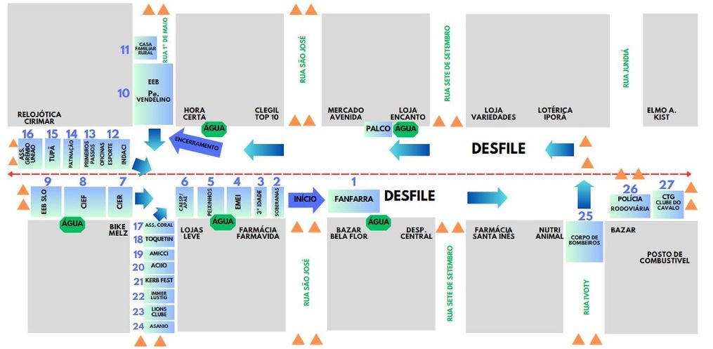 Conforme o sargento da Polícia Militar do município, Milton Wolf, o início do desfile será na Avenida Gustavo Fetter na esquina com a Rua São José, nas intermediações da Farmácia Farmavida, seguindo até em frente à empresa Elmo A.Kist e retornando pela Avenida até em frente ao Hora Certa Conveniência.