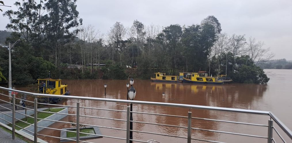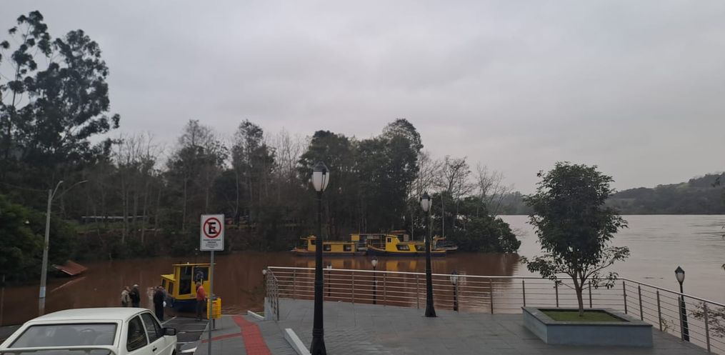 Com o nível de água a cerca de nove metros, a travessia de veículos com a balsa no Rio Uruguai segue interrompida nesta quinta-feira, 13, entre os municípios de Mondaí/SC e Vicente Dutra/RS.