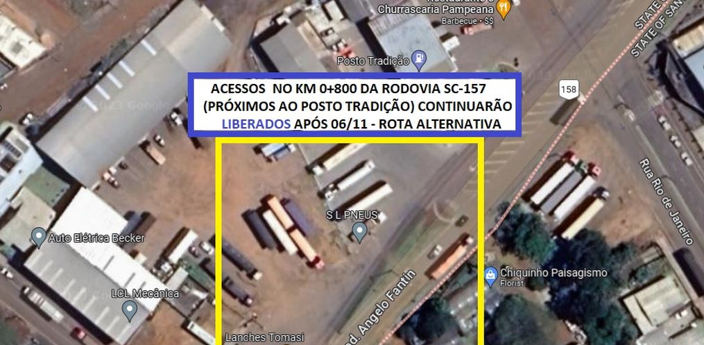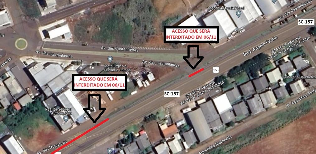 A Coordenadoria Regional de Infraestrutura Extremo Oeste emitiu uma nota de alerta a população dos municípios de São Lourenço do Oeste/SC e Vitorino/PR, e demais usuários da rodovia estadual SC-157, que dois acessos localizados no lado esquerdo do Contorno Armindo Ecker, especificamente nos km 1+350, Avenida das Nogueiras em frente a Realiza Serviços Automotivos, e 1+250 Avenida das Castanheiras em frente a RRK Pneus serão bloqueados a partir do dia 06 de novembro pela SIE.