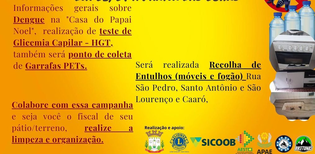 O início será às 8 horas em frente ao Sicoob, na Casa do Papai Noel, onde serão repassadas diversas informações referente a dengue, também será realizado o Teste de Glicemia Capilar, será ponto de coleta de garrafas pet e também serão recolhidos entulhos nas ruas onde no momento a proliferação do mosquito da Dengue está maior.