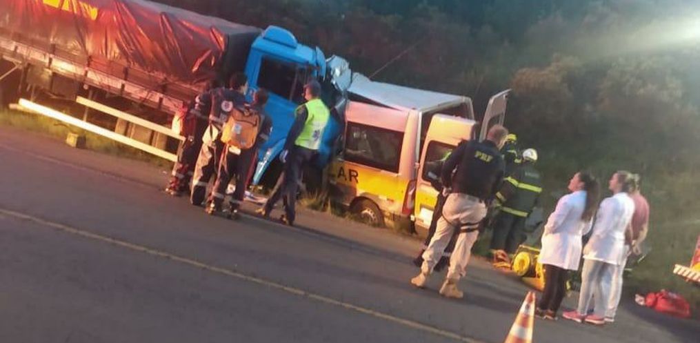 Uma colisão entre uma van escolar e um caminhão foi registrada na BR-153, em Água Doce, nas proximidades do posto da Polícia Rodoviária Federal. O local fica próximo também da divisa com General Carneiro/PR.