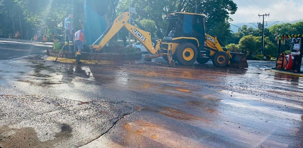 O setor de água da prefeitura trabalha com o auxílio de máquinas para resolver o problema. Com a manutenção, algumas ruas devem ficar sem água neste sábado, 26.