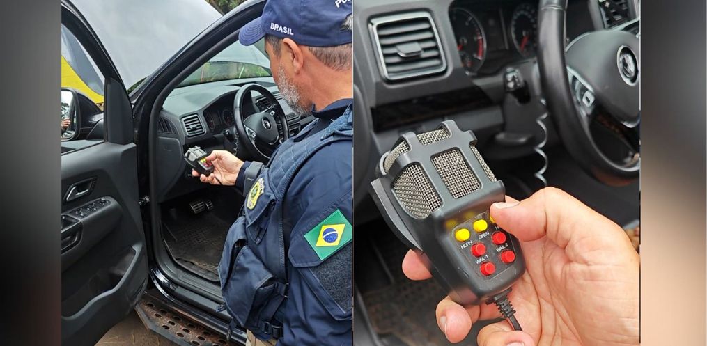 Além da placa dianteira com caracteres apagados e sem condições de legibilidade, dentro da caminhonete Volkswagen Amarok havia um dispositivo eletrônico incomum bem próximo ao condutor, que foi percebido ao serem solicitados os documentos de rotina.