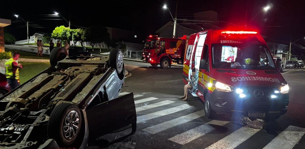 Com o impacto da batida, o Sandero acabou capotando. A Polícia Militar também esteve presente para realizar os procedimentos necessários.
