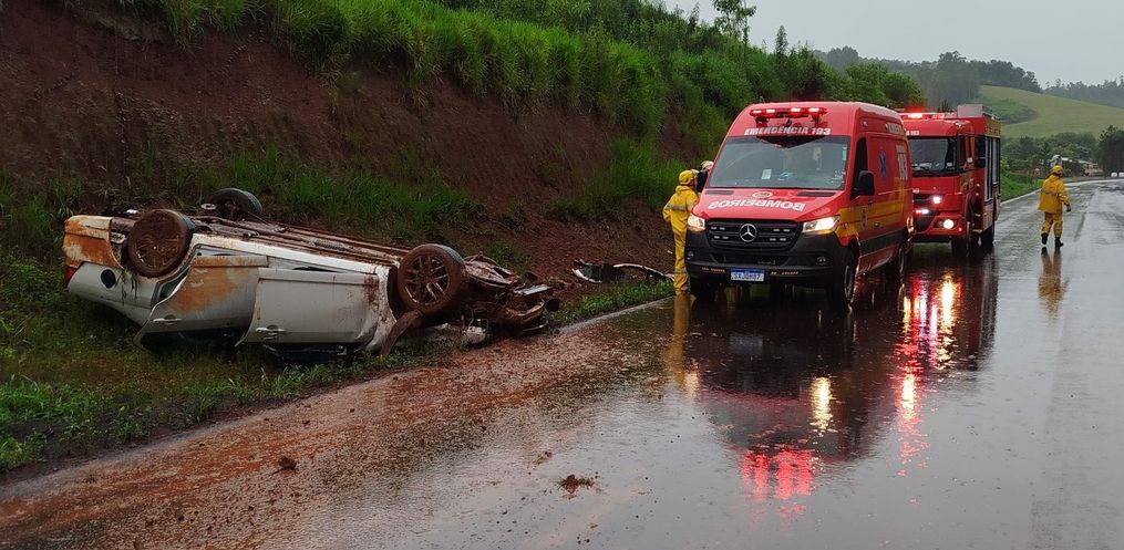 Um veículo saiu da pista e capotou por volta das 17h desse sábado, 7, na BR 282, em Cunha Porã.
