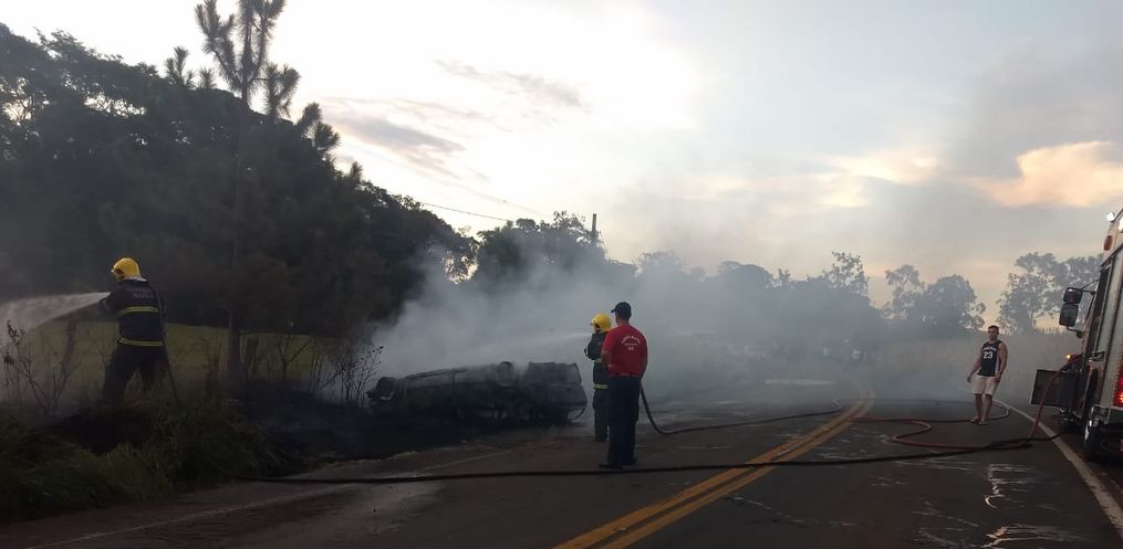 O veículo incendiou após o acidente e o Corpo de Bombeiros apagou o fogo e realizou o rescaldo das chamas.