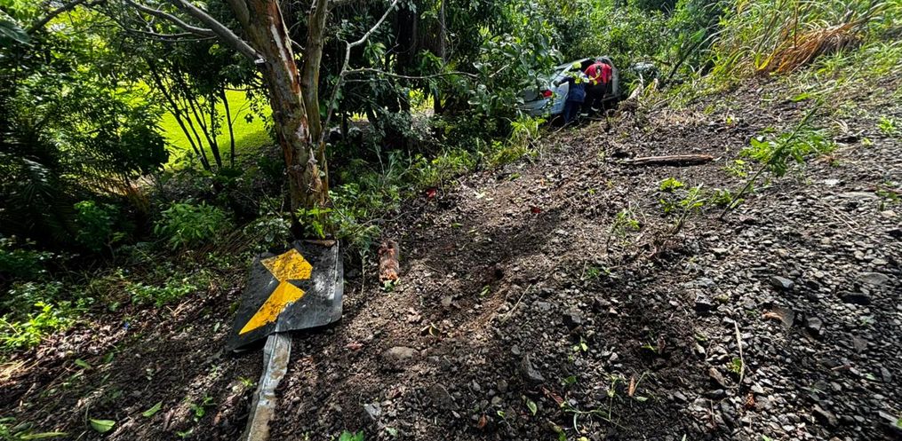 O veículo ficou lateralizado, escorado em algumas árvores. O barranco era de aproximadamente 10 metros.