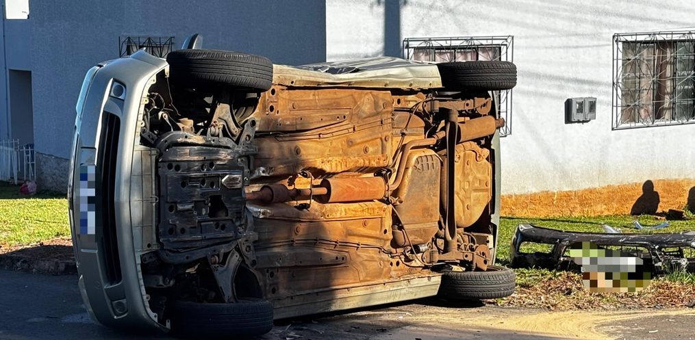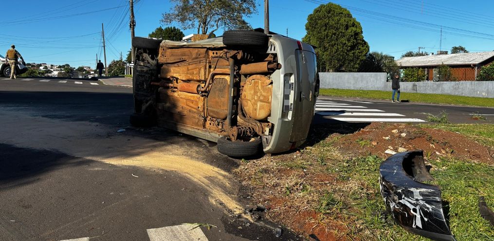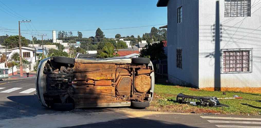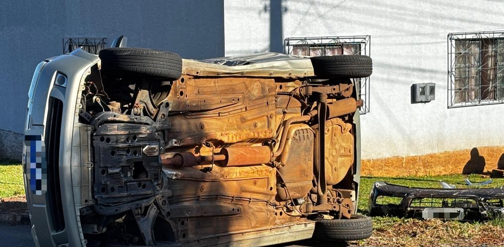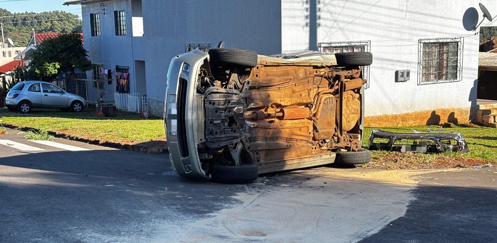 Um veículo tombou após uma colisão por volta das 09h desta segunda-feira, 12, no Bairro São Luiz, em São Miguel do Oeste.