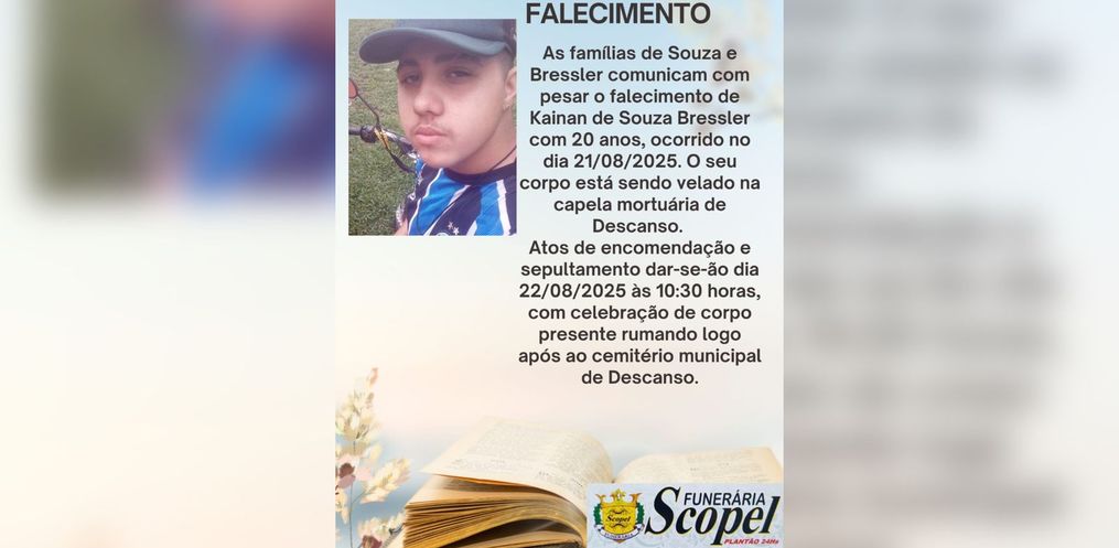 O velório de Kainan De Souza Bressler, de 20 anos, acontece nesta sexta-feira, 22, na capela mortuária de Descanso. A cerimônia de encomendação, com missa de corpo presente, está marcada para às 10h30, seguida do sepultamento no Cemitério Municipal.