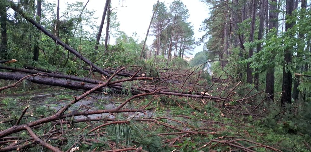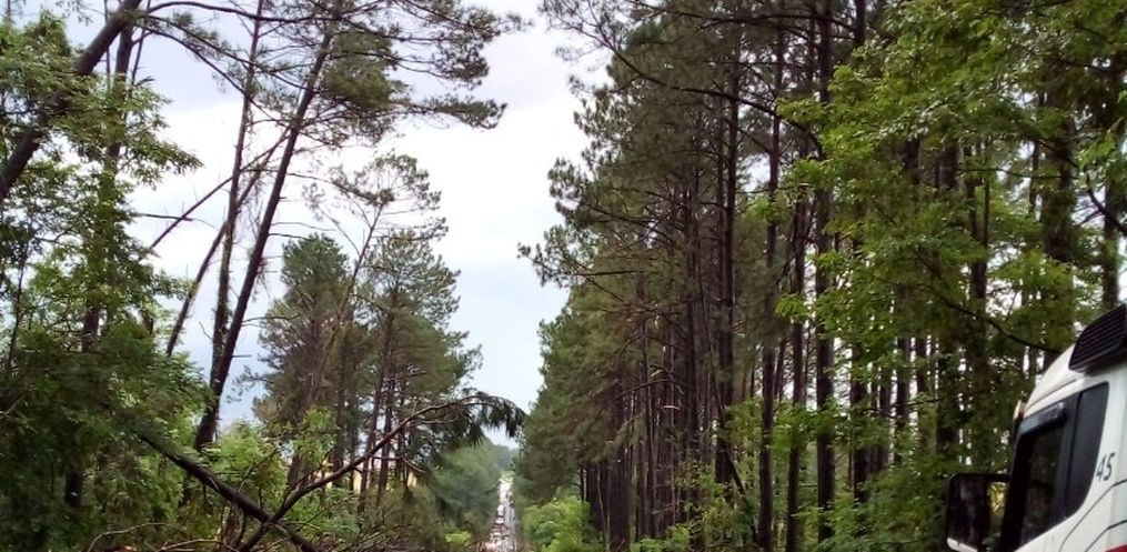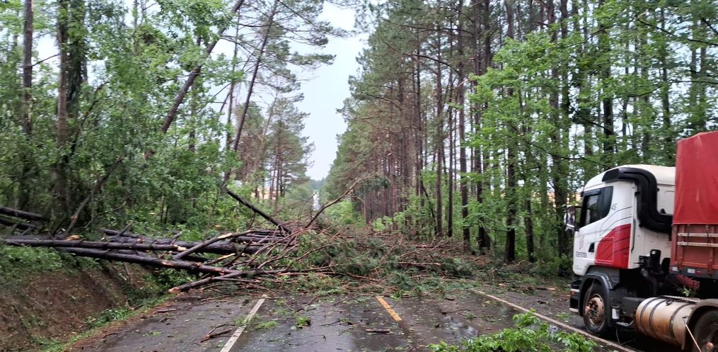 Algumas árvores foram quebradas e outras arrancadas. Atuam na ocorrência o Corpo de Bombeiros de Panambi, prefeitura e PRF.