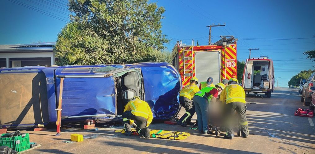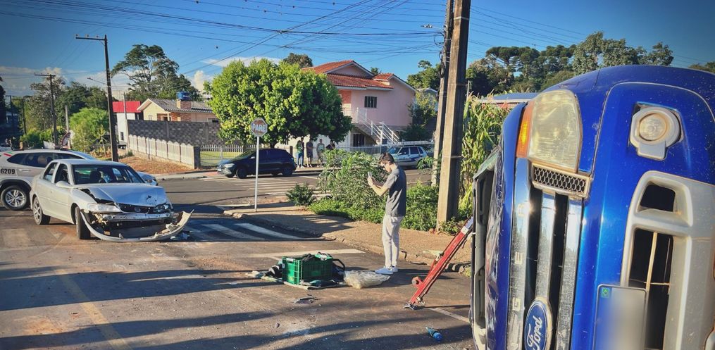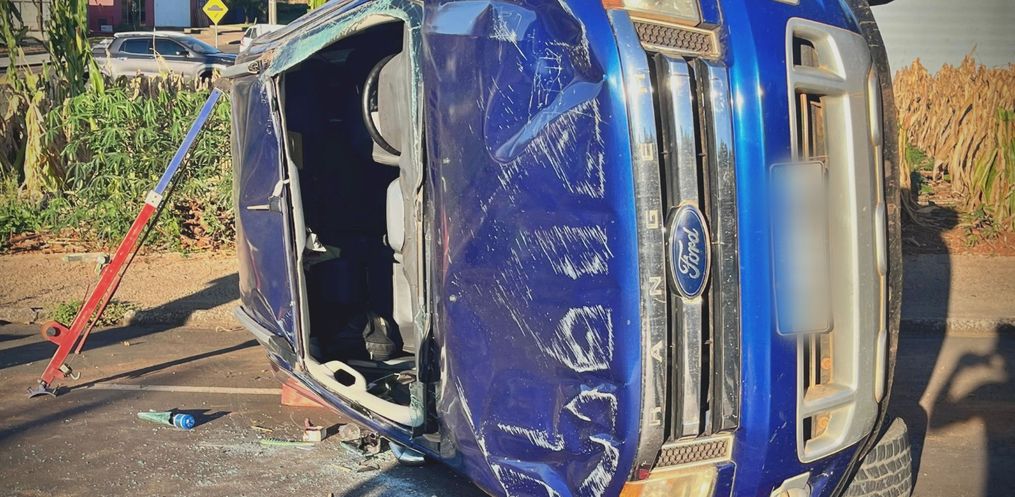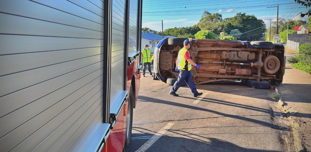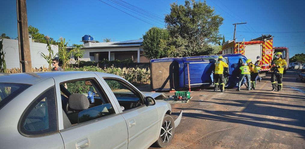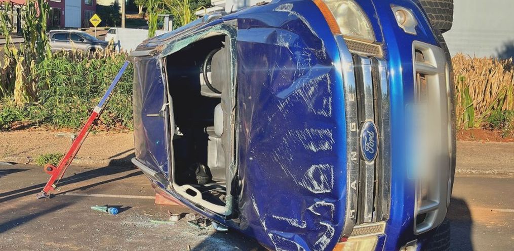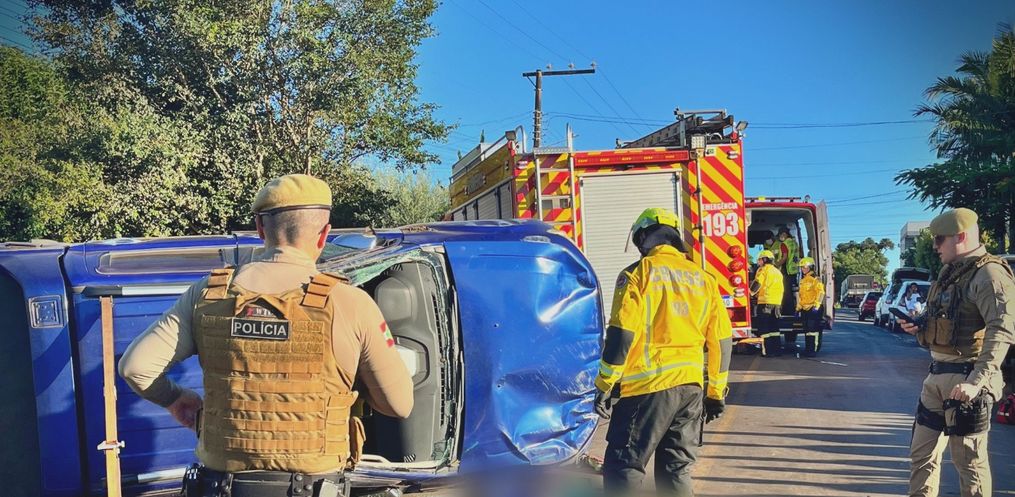 Após o impacto, a camionete tombou sobre a via. Os dois ocupantes, um homem e uma mulher, foram socorridos conscientes e orientados e encaminhados ao Hospital Regional.