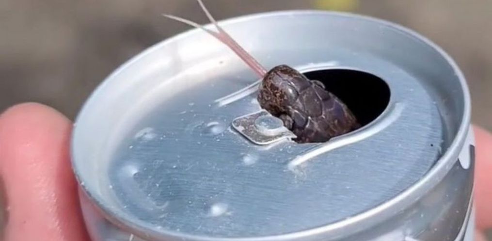 Desta vez, a cobra se escondeu dentro de uma latinha de energético. E parece que ela não estava com muita vontade de sair de lá, não. “Um senhor me ligou falando que tinha uma cobra dentro de uma latinha. Ele cata latinha pela cidade, foi amassar, acabou encontrando esse animal e acionou o resgate. A parte mais difícil era tirar ela porque não saía”, contou.