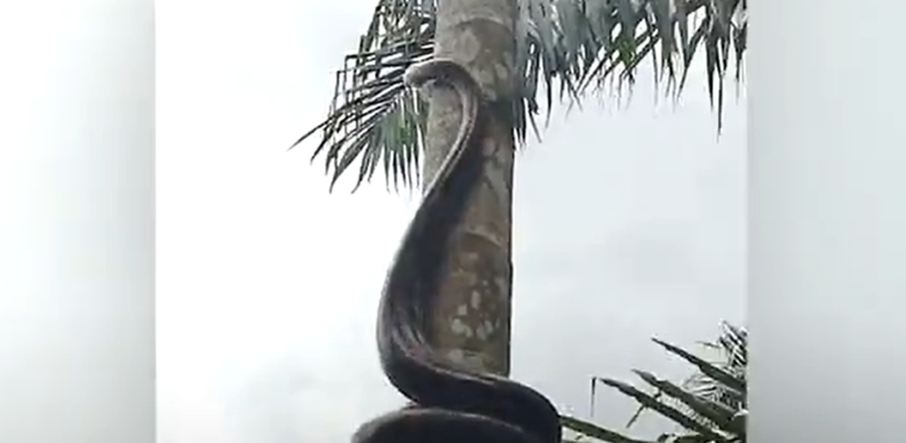 No vídeo é possível ver a cobra da espécie píton escalando uma palmeira. O tamanho avantajado do bicho surpreende qualquer pessoa.