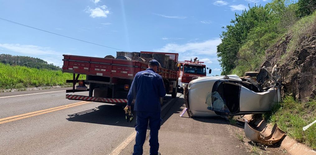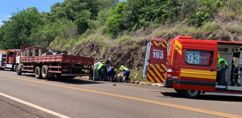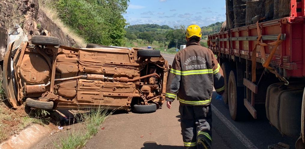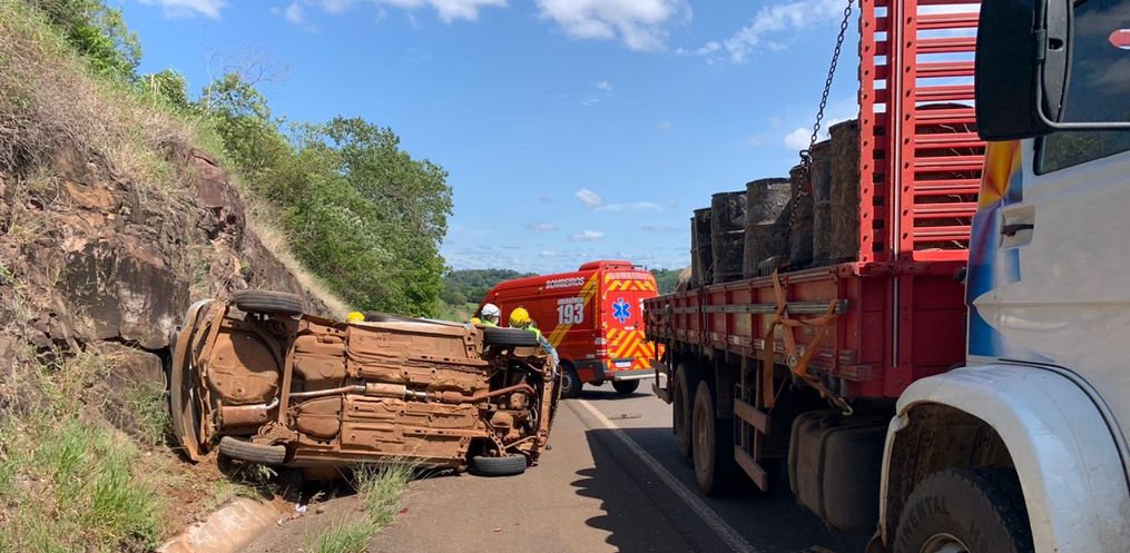 Quando o Corpo de Bombeiros chegou no local, um dos homens já estava fora do veículo com cortes na cabeça, o outro estava preso embaixo do veículo. Ele foi retirado do veículo com ferimentos graves.