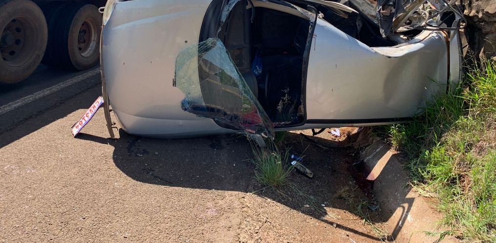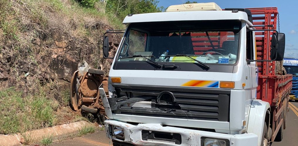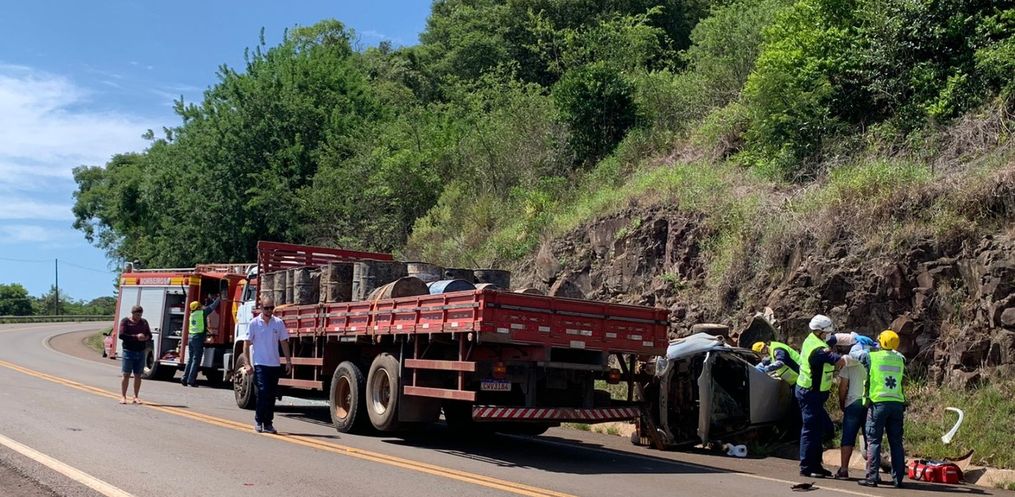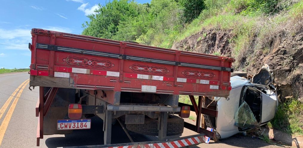 O condutor do caminhão contou aos Policiais Rodoviários que fazia sentido Paraíso/São Miguel do Oeste quando o carro que fazia sentido contrário se perdeu em uma curva, batendo de frente no caminhão.