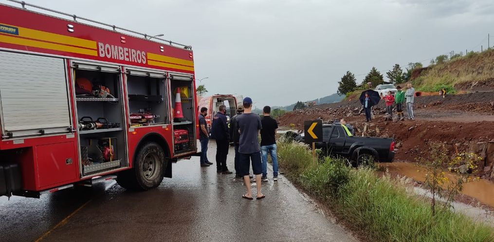 Saída de pista com caminhão deixa motorista ferido no interior de São Miguel do Oeste