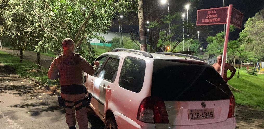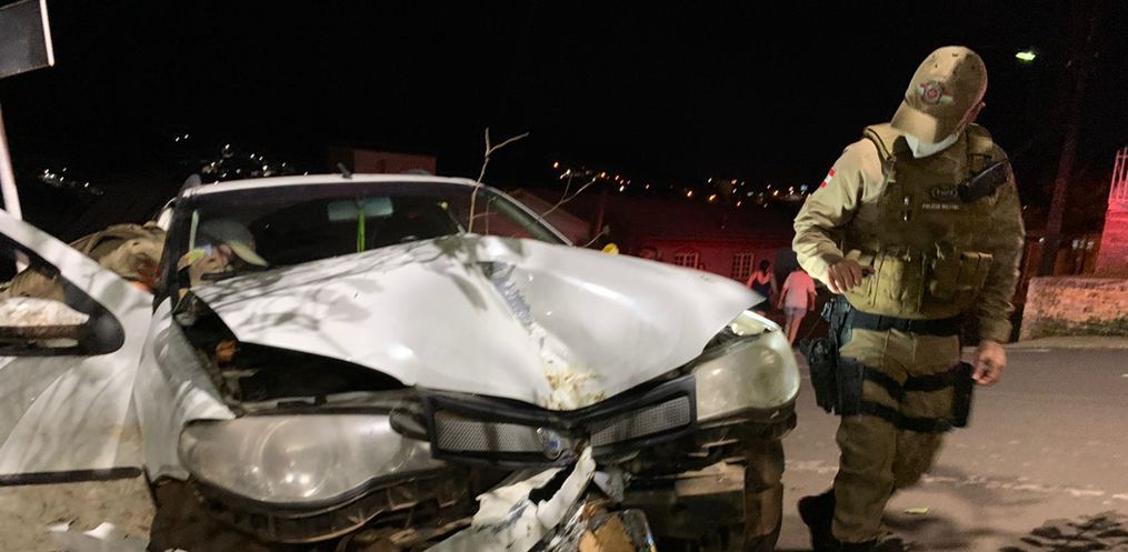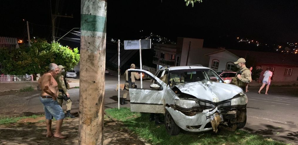No local, o condutor de uma Palio Weekend, placas de Cunha Porã colidiu em uma árvore, em frente a praça do bairro.