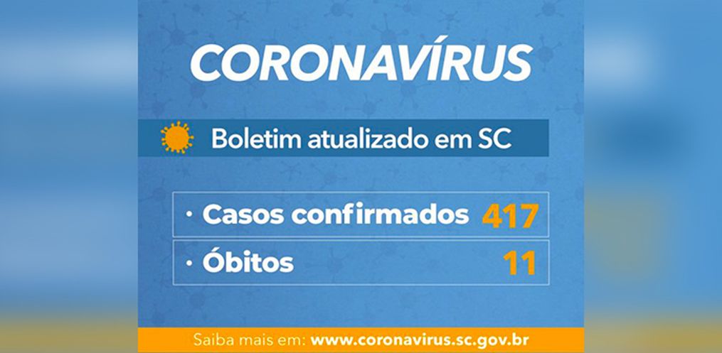 Santa Catarina registra 417 casos confirmados de Covid-19 nesta segunda-feira, 6. O número representa um aumento 10% em relação ao último boletim. Desde o começo da pandemia, foram confirmadas 11 mortes no Estado por conta da doença. A última delas foi de um homem de 57 anos de Gaspar, que fazia parte do grupo de risco por apresentar comorbidades.