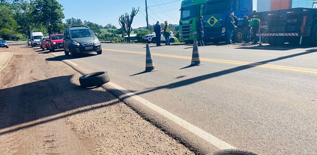 A rodovia está fechada com máquinas, cones e pneus. Caminhões, ambulâncias e situações de emergência possuem trânsito liberado.